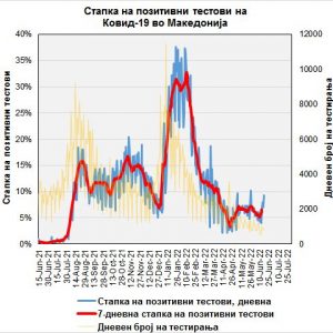 Стапката на позитивни тестови (црвената линија на третиот дијаграм) ни дава уште една потврда дека нешто се случува, односно дека тивко започнува ширењето на вирусот во популацијата, најверојатно потсојот BA4 или ВА5.