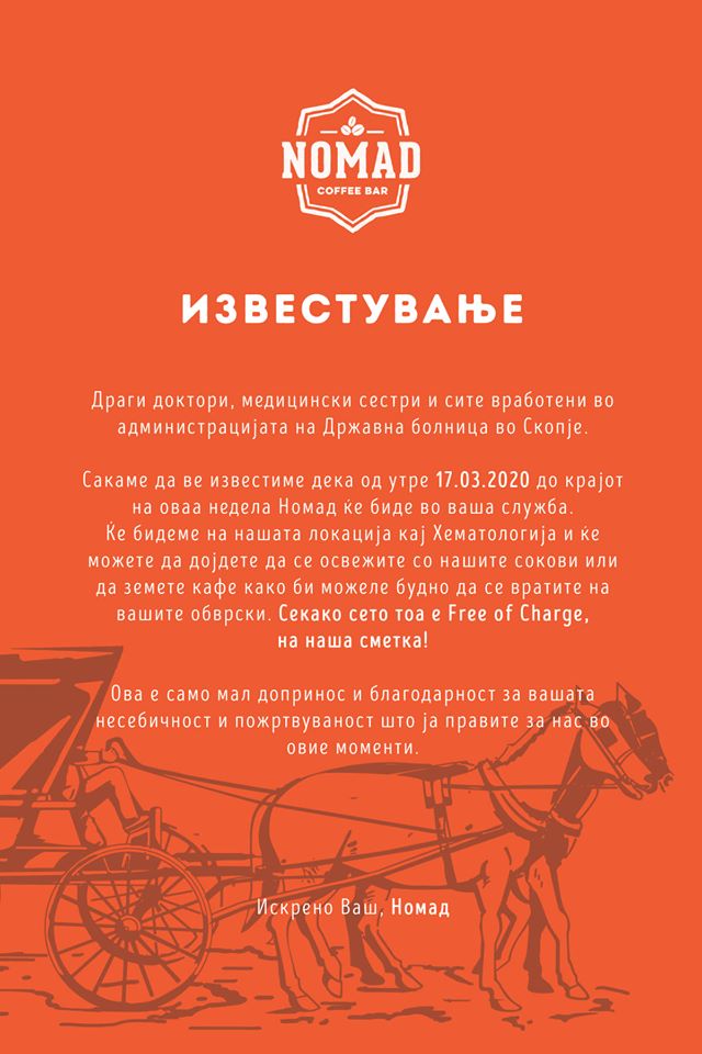 Мобилниот кафе-бар „Номад“ преку Фејсбук информираше дека од утре сите доктори, медицински сестри и вработени во администрацијата на Државната болница ќе можат бесплатно да се освежат со сок или кафе од нивниот бар кој ќе биде поставен во кругот на болницата.