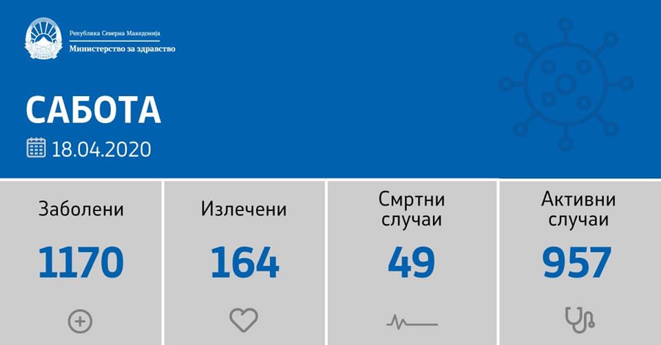 Според последните податоци објавени вчера, бројот на заразени со коронавирусот во Македонија изнесува 1.170.