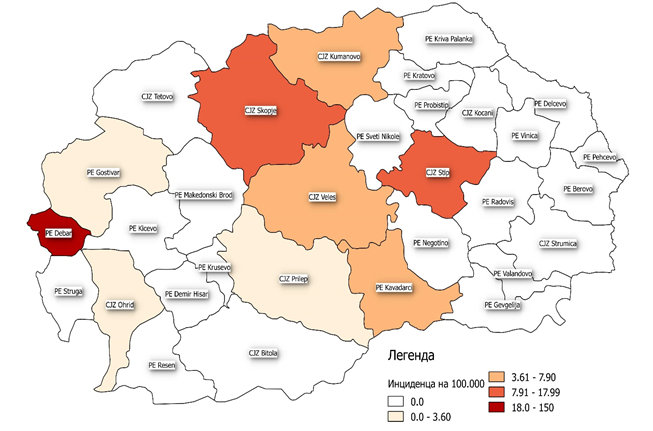 Највисока кумулативна инциденца на 100.000 жители се регистрира во Дебар со 144,7 заболени на 100.000 жители, а во Скопје инциденцата е 17,5 на 100.00 жители, додека во Штип инциденцата на 100.000 жители е 13,3“, стои во анализата на податоците од страна на Институтот за јавно здравје.