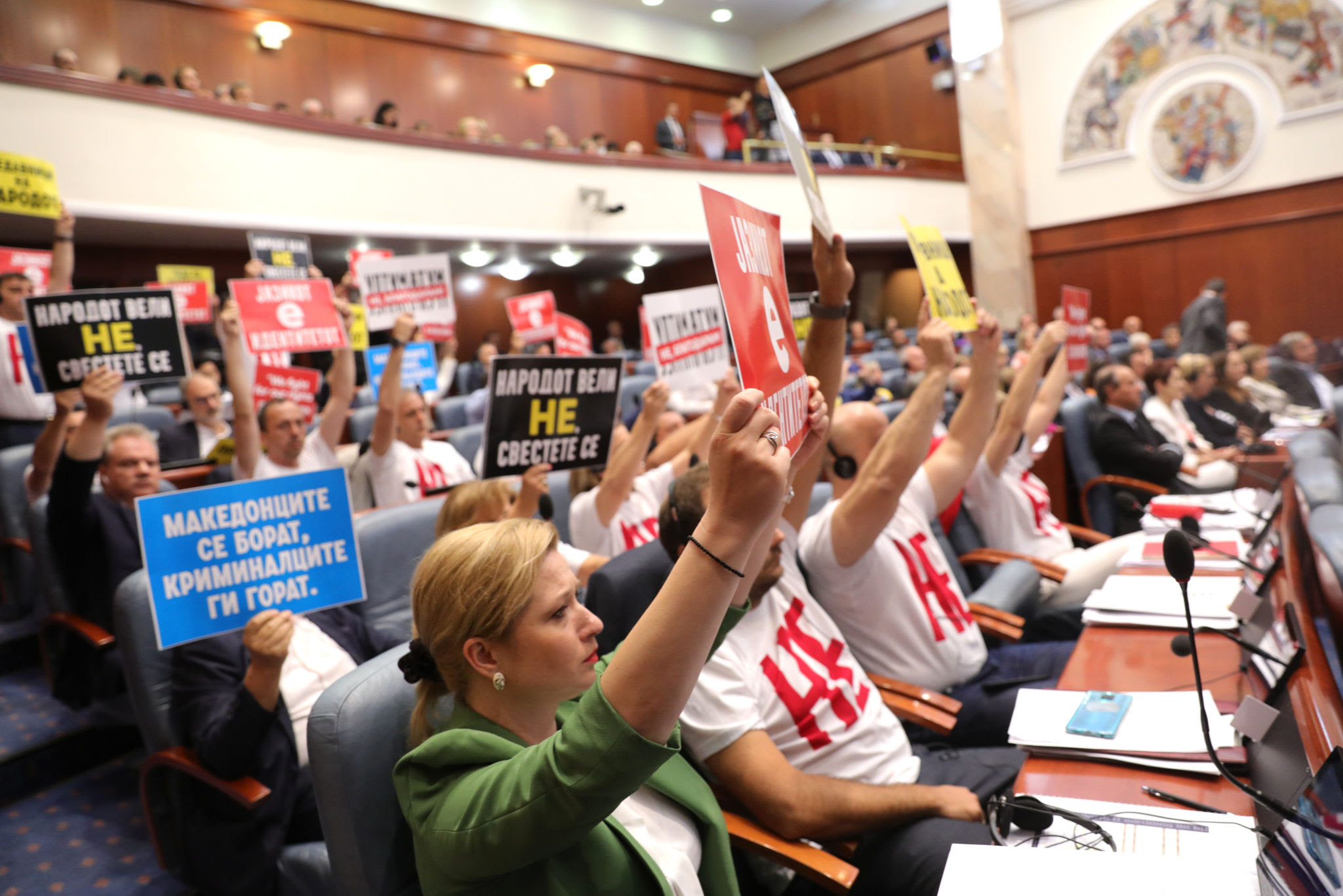 За време на обраќањето на Фон дер Лајен пратениците од опозицијата извадија транспаренти „предавници на народот“, „јазикот и идентитетот“, „народот вели не, свестете се“ и други.