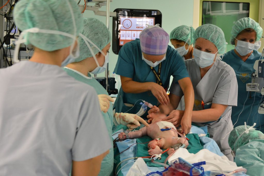 После соодветна подготовка, штотуку родениот мал пациент вчера беше успешно опериран. Се работи за т.н. тотална транспозиција на главни крвни садови, една од најкомплексните аномалии на срцето, со која сите крвни садови излегуват обратно од срцето, со тоа крвта циркулира во обратен правец, овие деца се сини и заради недостаток од кислород умираат набрзо после породувањето.