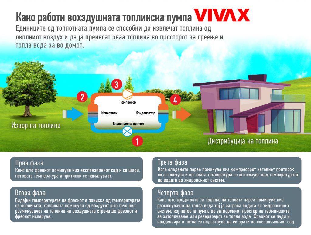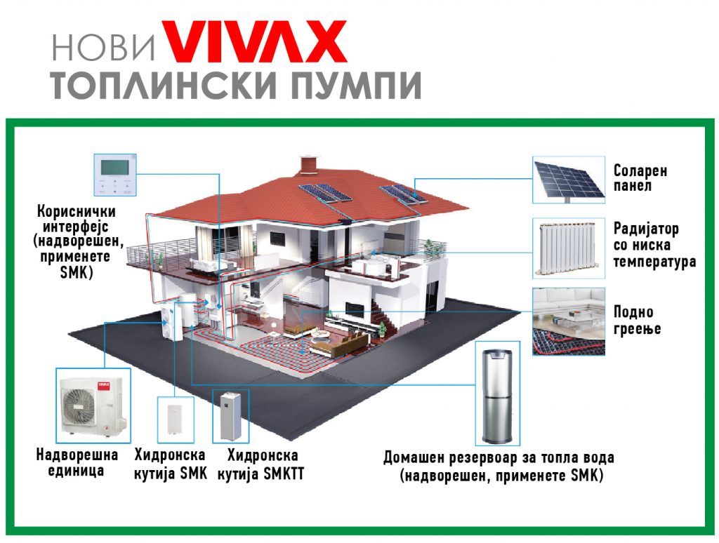 Преку искористување на обновливите природни ресурси, компанијата VIVAX се вклучува во решавање на најголемиот глобален проблем – загaдувањето и уништувањето на природата, со воведување на нови топлински пумпи на македонскиот пазар.