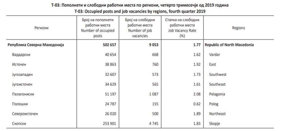 Според податоците на Државниот завод за статистика, во четвртото тримесечје од 2019 година во Македонија имало 9.053 слободни работни места односно стапката на слободни работни места изнесувала 1.77 %.