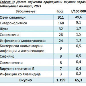 Оваа се десетте најчесто пријавувани акутни заразни заболувања во месец март, според билтенот за движењето на акутните заразни заболувања во Македонија, кој еМагазин редовно го пренесува: