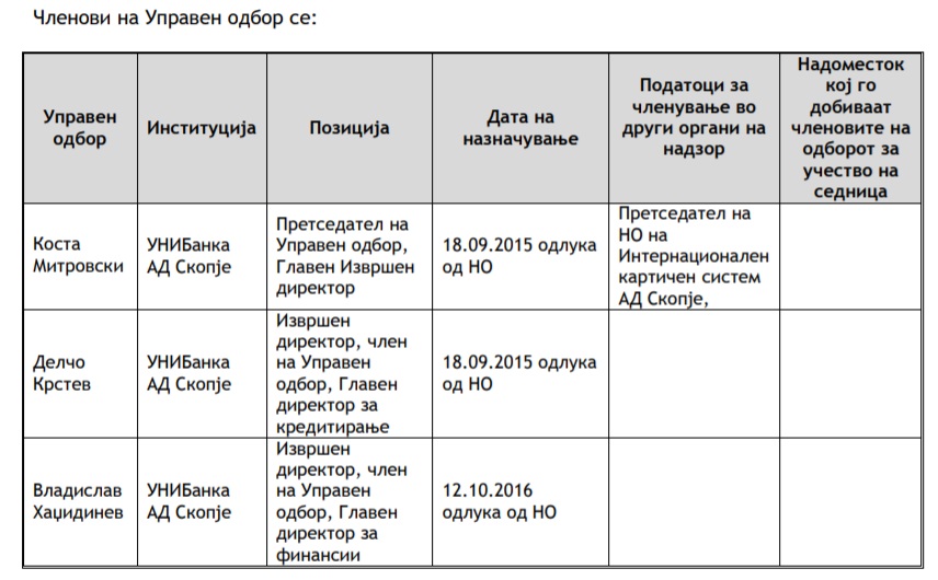 На тројцата членови на Управниот одбор на УНИ Банка во текот на минатата година им биле исплатени вкупни надоместоци од 34 милиони денари или околу 555.000 евра, покажува годишниот извештај за работењето на банката објавен преку Македонската берза.