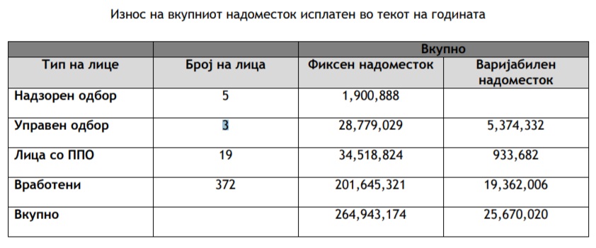 Од вкупниот износ, по основ на фиксен надоместок им биле исплатени 28,7 милиони денари, а по основ на варијабилен надоместок добиле 5,3 милиони денари.